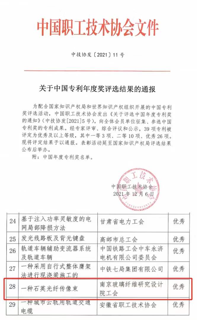 2021年12月6日,中國職工技術協會公布首屆中國專利年度獎評選結果,南京春輝科技實業有限公司參選的“一種石英光纖傳像束”專利榮獲中國專利年度獎——優秀獎。在本次中國專利年度獎評選中,經專家評審、綜合評議和公示,共有39項專利被評定為優秀及以上等級,其中江蘇省范圍參選專利有9項獲獎。